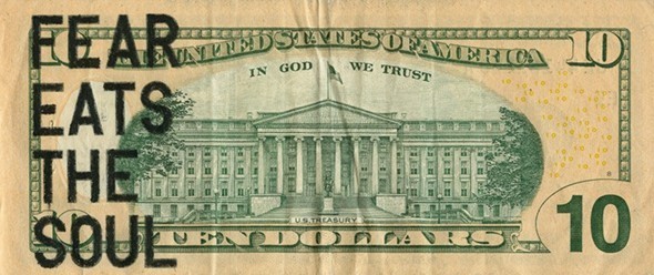 Rirkrit Tiravanija has repeatedly referenced Fassbinder’s iconic film Fear Eats the Soul in his work since 1994 – on t-shirts, on banknotes, in paintings and, most recently, in the title of an exhibition. In his poster for Spike, Tiravanija continues in the same vein, with a true-to-scale blow-up of a $10 bill bearing the film title, clashing with the truly one-dimensional platitude of the famous American motto »In God We Trust«.